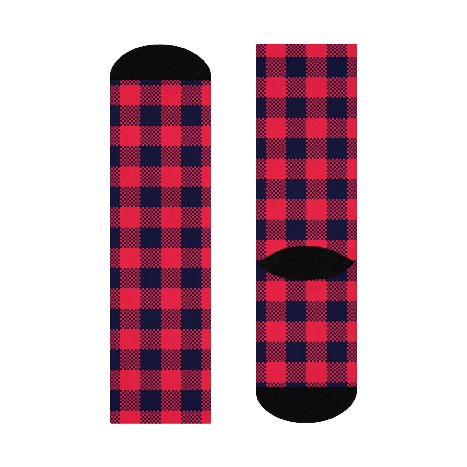 These cushioned crew socks bring the warm, lived-in comfort of a cabin evening to everyday life. The bold red-and-navy buffalo check wraps around the leg in a smooth, all-over print, while black heel and toe panels add contrast and durability. Soft, stretchy fibers hug your foot without constricting, and the plush cushioned sole keeps steps quiet and cozy — the kind of comfort that encourages you to linger by a window with a mug or lace up for a brisk walk. Lightweight yet substantial thanks to a 200-needle knit, they move seamlessly from relaxed home days to brisk outdoor errands. Slip them on for a touch of rustic pattern mixed with modern printing clarity; they feel familiar right away and hold their color and shape through wear.